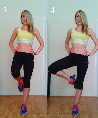 Stojąc na jednej nodze odchylamy drugą nogę w trzech kierunkach, pracując tym samym na zgrabne nogi i jędrną pupę.